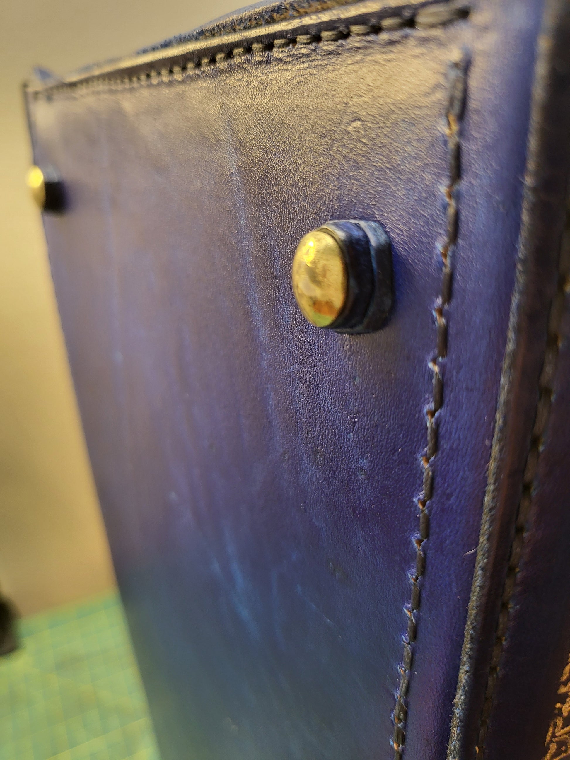 - Solid brass hardware throughout, including custom-fabricated Chicago screw feet with blue leather washers